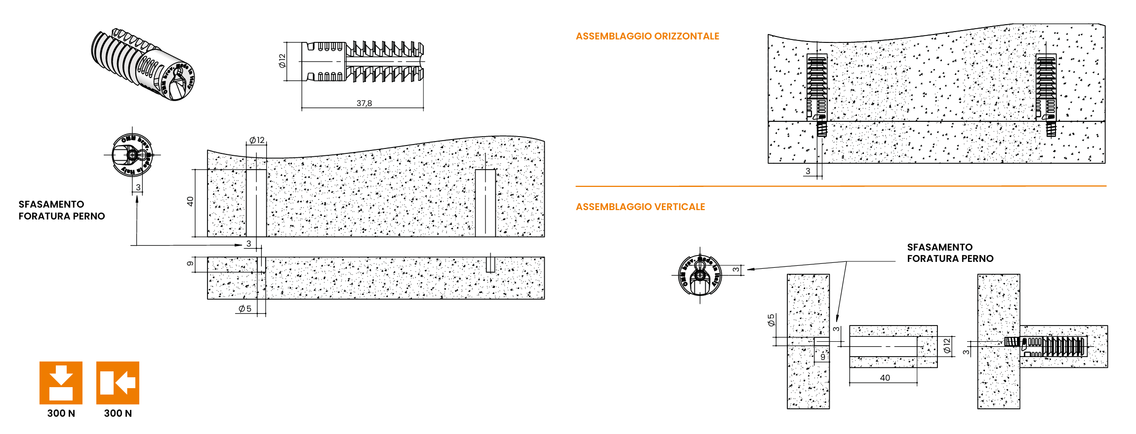 La giunzione è utilizzable sia per montaggio con scorrimento orizzontale dell'elemento, che con scorrimento verticale.