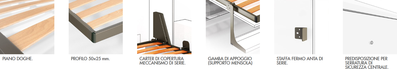 Questo esclusivo sistema letto autoportante combina stabilità strutturale e comfort elevato, ideale per armadi con profondità minima di 420 mm e fianchi robusti da almeno 25 mm. Progettato per non scendere a compromessi sulla qualità del riposo, accoglie materassi standard alti fino a 230 mm. L'anta liscia è ingegnerizzata per l'integrazione di un divano trasformabile, ma la vera innovazione risiede nella cinematica della gamba di appoggio: essa funge anche da supporto per la mensola che, durante l'apertura, si muove mantenendosi perfettamente parallela al pavimento, permettendo di lasciare gli oggetti in posizione. La movimentazione, fluida e sicura, è interamente gestita da molle a gas calibrate.