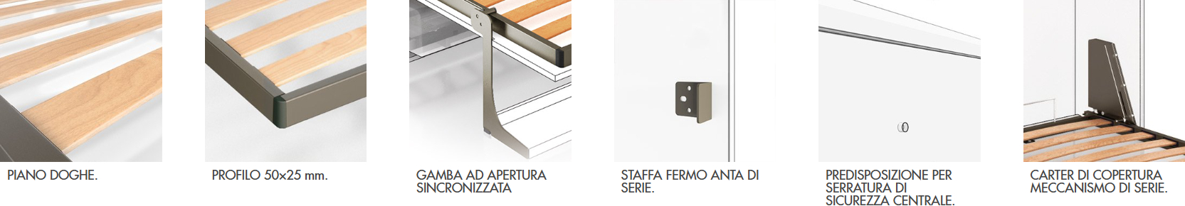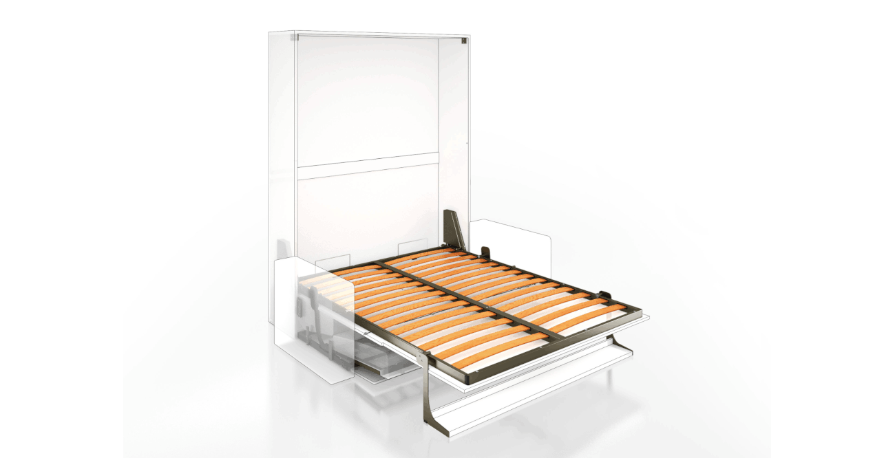 Questo sistema per letti verticali offre una versatilità eccezionale: installabile in armadi con profondità minima di 420 mm e disponibile per tutte le dimensioni di rete, assicura un comfort notturno domestico grazie alla compatibilità con materassi standard alti fino a 230 mm. Il design del frontale è altamente personalizzabile: l'anta liscia può essere realizzata con dimensioni ridotte a tutta altezza per esigenze estetiche specifiche, oppure lavorata con fresature dedicate per alloggiare la gamba a caduta e integrare perfettamente il divanetto. Il tutto è supportato da una meccanica affidabile, con movimentazione assistita da molle a gas per un'apertura leggera e controllata.