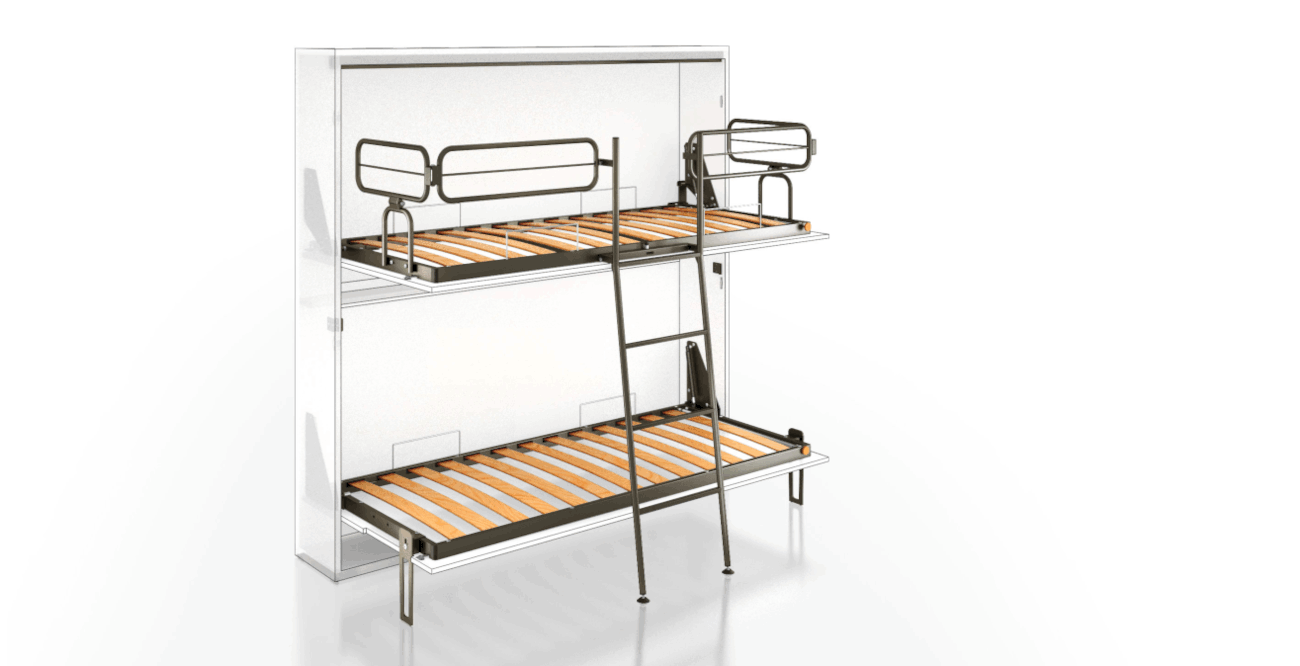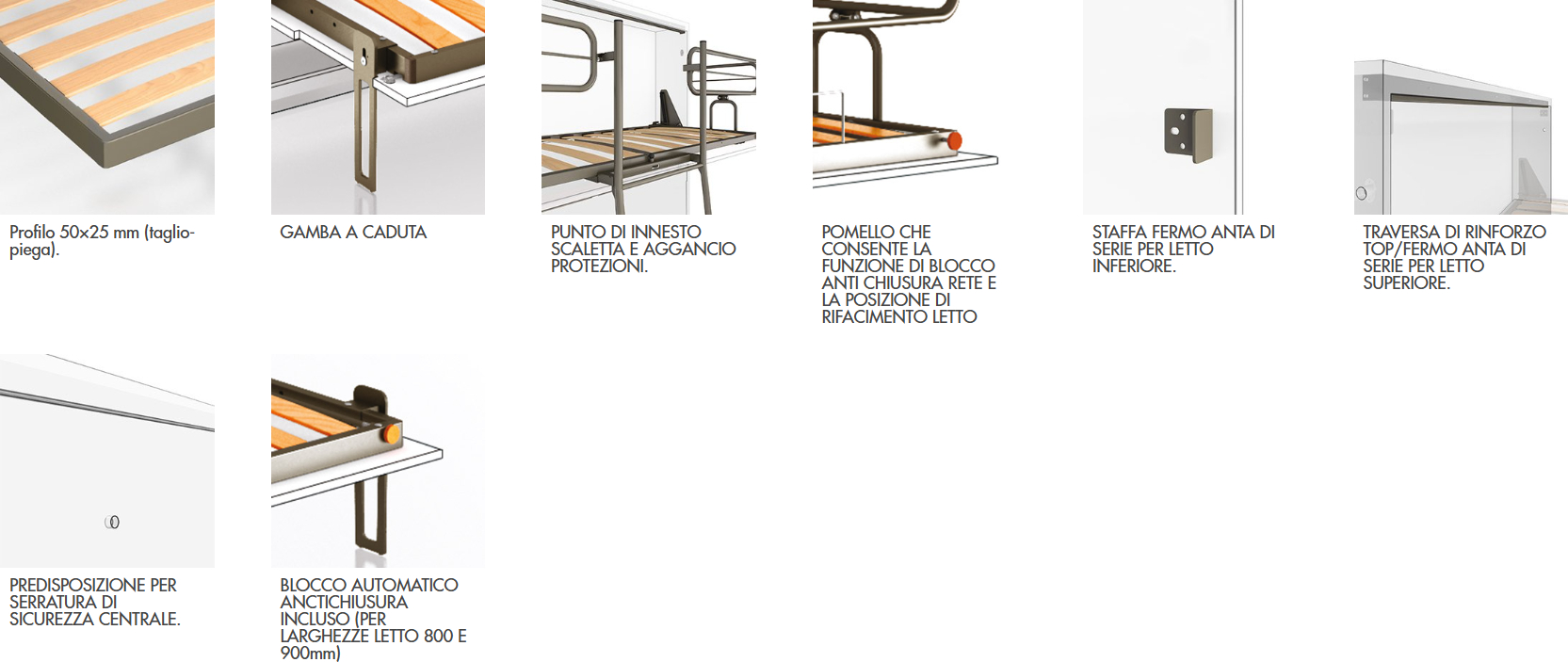 Ideale per ottimizzare lo spazio in altezza, questo sistema per letto a castello singolo è compatibile con armadi dalla profondità minima di 330 mm. L'estetica pulita dell'anta è caratterizzata da fresature funzionali all'alloggio della gamba a caduta del letto inferiore, completa di puntale in PVC antiurto per la massima delicatezza sui pavimenti. Un punto di forza è la rete superiore: autoportante e svincolata dalla struttura sottostante, è dotata di un meccanismo inclinabile che agevola le operazioni di rifacimento del letto. La movimentazione fluida è affidata a molle a gas, mentre l'accesso è reso sicuro da protezioni ancorate alla scaletta autoportante. Per le versioni da 800 e 900 mm, infine, è previsto di serie un blocco automatico antichiusura per garantire una totale tranquillità d'uso.